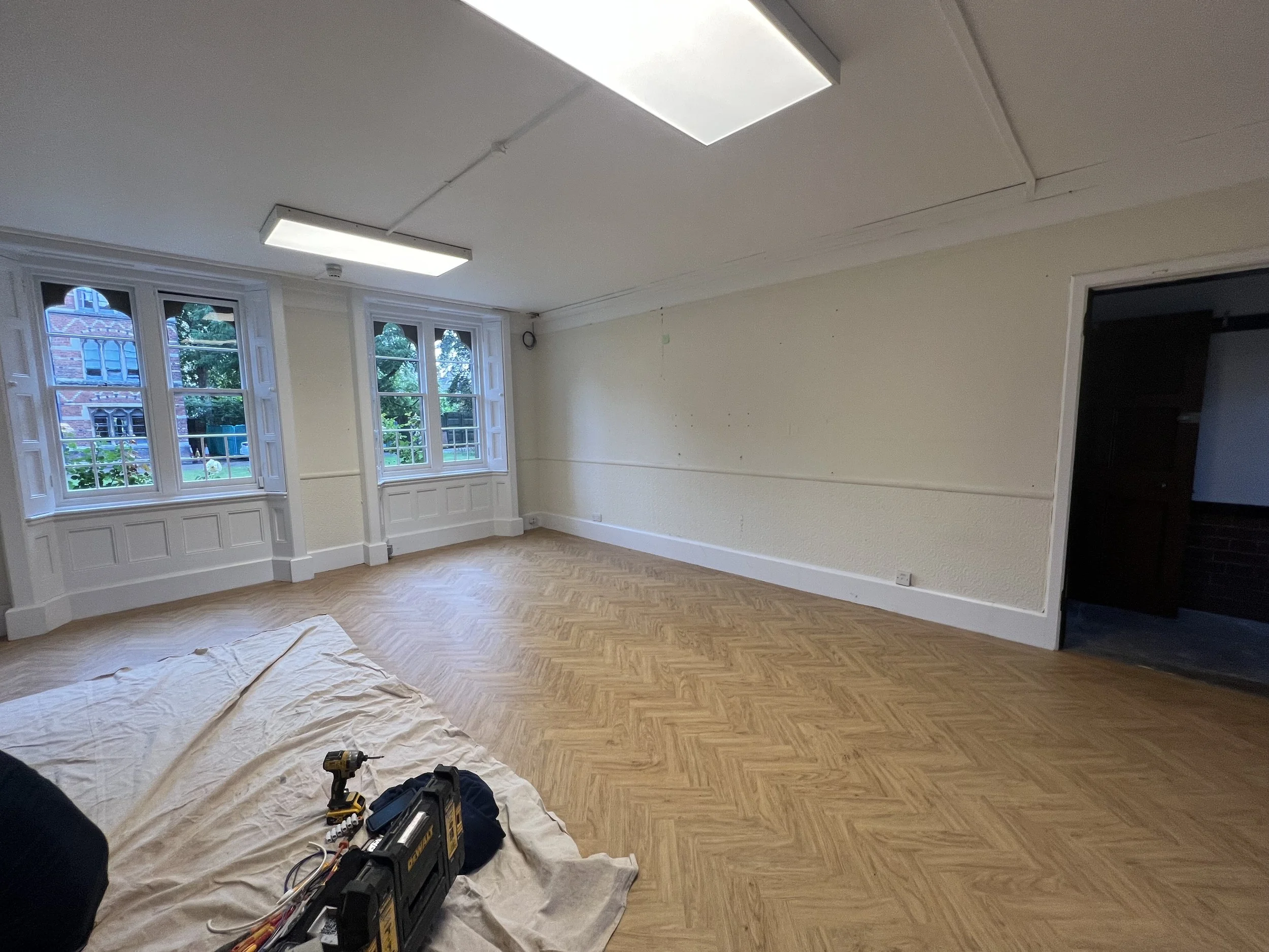 The budget was set and I negotiated a debit plan with the new Bursar, Ivan Rockey, and carefully planned the work with the Head of Rooms Division, Oana Darac-Pelea, the Domestic Bursar, James McLaren, and the Head of Maintenance, Steve Holtom. Old furniture was handed to Better Reuse and personal items were donated back to the community. By August, the room was entirely cleared. In September, the work began: the lighting was changed, floorboards were installed, and the walls were repainted. I met with our furniture contractor, Maton Rose, to finalise the design of the tailored furniture as well as the colour palette.